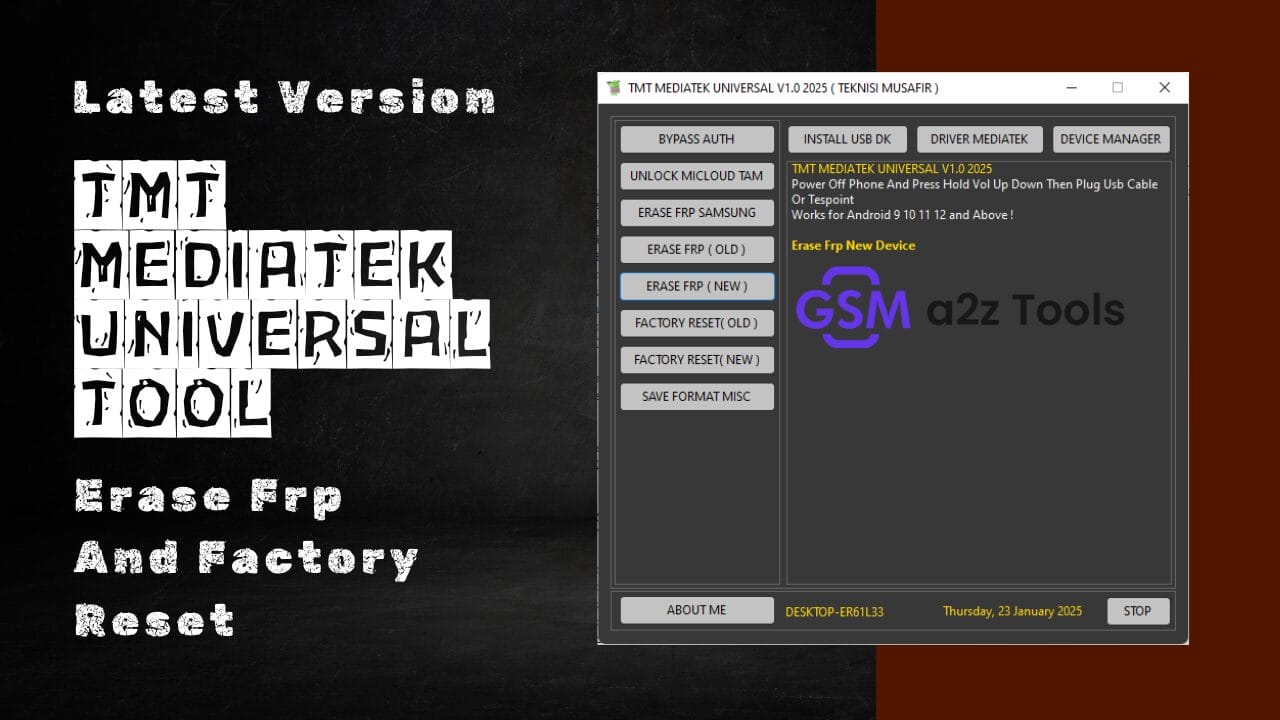 The Tmt Mediatek Tool Is A Security Management Solution For Mediatek Devices. With Features Such As Bypass Auth And Unlock Micloud Tam, This Powerful Solution Makes Device Security Management Effortless. Users Can Erase Frp For Old And New Devices, Perform Factory Reset Operations As Necessary, And Utilize Save Format Misc To Ensure Optimal Data Handling.